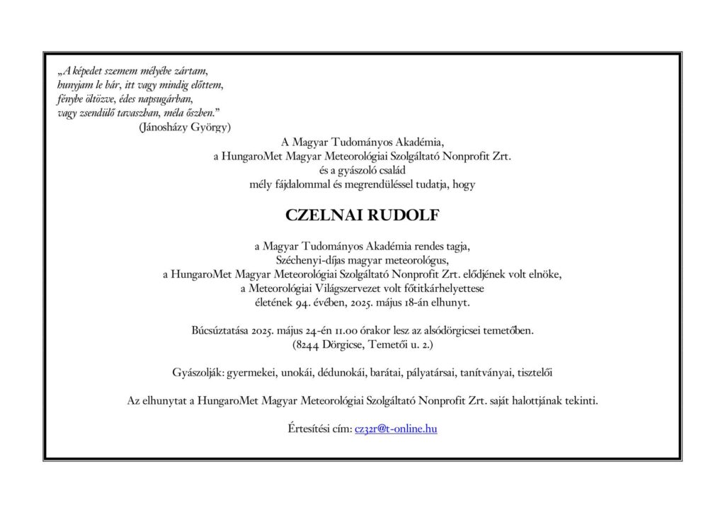 2025. május 18-án, életének 94. évében elhunyt Czelnai Rudolf meteorológus, a Magyar Tudományos Akadémia rendes tagja.
