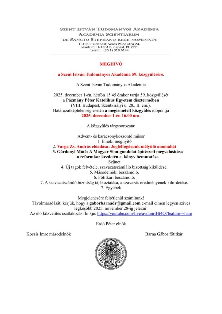A 2023. március 20-án, a Pázmány Péter Katolikus Egyetem jogi karának Dísztermében tartott eseményről a Magyar Kurír fényképes beszámolóban tudósított. A közgyűlést követően a résztvevők Dr. Barna Gábor jubileumi előadását is meghallgathatták a Szent István Társulatról, mely idén ünnepli alapításának 175. évfordulóját.